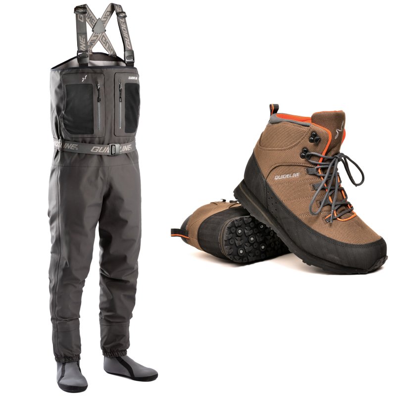 Guideline Laxa Traction 2.0 Wadingcombo, eine Kombination, die Sie trocken und sicher in der Strömung halten wird. Eine sehr preiswerte Kombination!WathoseDie Laxa 2.0 Wathose verfügt über die wichtigsten Eigenschaften und bietet dennoch ein optimales Preis-Leistungs-Verhältnis.Dauerhaftes, 4-lagiges Nylongewebe, PFOA-freie Oberflächenbehandlung und Sidewinder-Design.Hergestellt aus einem starken, 4-lagigen Nylongewebe mit einer 20 000mm wasserdichten und 5000g/m2/24h feuchtigkeitstransportierenden Membran. Eine umweltfreundliche PFOA-freie DWR-Oberflächenbehandlung weist sowohl Schmutz als auch Wasser von der Außenhaut ab. Die Nähte an der Wathose sind durch unser Sidewinder-Design eliminiert, das zudem eine gute Beweglichkeit und eine bequeme Passform bietet. Hoch auf der Brust befinden sich zwei große, mit vertikalen Reißverschlüssen versehene Brusttaschen mit Mesh-Fronten. Auf der Rückseite befinden sich mit Fleece gefütterte, geräumige Handwärmertaschen für kühle Tage.Verstellbare Hosenträger, eine hintere Gürtelschlaufe mit zwei Höhen und ein elastischer, verstellbarer Watgürtel mit Schnellverschluss sorgen für einen guten Sitz. Die Unterschenkel sind mit starken, schweren Stoff-Kiesschützern mit gummiverstärkten Stretchbündchen ausgestattet. Die individuell geschnittenen hochdichten Neoprensocken haben eine gute Passform und eine Links/Rechts-Form für zusätzlichen Komfort.Farbe: Graphitgrau mit passenden grauen Hosenträgern, Gürtel und Socken.Atmungsaktivität 5000Gewebe 4-lagiges Nylon TaslanWasserdichtigkeit 20000WatteschuheLeicht, komfortabel, langlebig und schnell trocknend. Laxa 2.0 ist eine aktualisierte Version des Vorgängermodells mit neuen Designelementen und Farbgebung.Klebrige Gummisohle mit Wolframstollen. Komplett PFC-frei und ohne Fluorcarbon / DWR-Behandlung.Laxa 2.0 ist eine aktualisierte Version des Vorgängermodells mit neuen Designelementen und einem Farbschema mit Brown Olive außen und Burnt Orange Futter und innen. Die Sohle besteht aus der gleichen gemusterten Sticky Rubber Gummisohle mit Wolframstollen. Das Vorgängermodell hatte Details aus PVC-Leder, aber diese Teile werden nun aus Umweltgründen durch andere Materialien ersetzt und der Stiefel ist komplett frei von Fluorkohlenwasserstoffen (PFC). Um den ökologischen Fußabdruck zu minimieren, werden die Stiefel in Boxen aus recyceltem Papier geliefert.Die Vorderseite und die Ferse haben eine dünne Verstärkungsschicht, die die Haltbarkeit und Steifigkeit erhöht, was bedeutet, dass sie auch bei härterem Waten in tiefem Wasser ihre Form behalten. Das bedeutet auch, dass die Vorderseite des Stiefels bei hohem Druck die Form besser behält und man nicht so leicht an den Zehen friert. Der untere Teil des Stiefels ist rundum mit Gummi verstärkt, um Abnutzung und scharfen Steinen beim Waten zu widerstehen. Eine Zwischensohle aus EVA erhöht den Komfort und sorgt für eine gute Stoßdämpfung beim Gehen auf hartem Untergrund. Gepolsterte Zunge und Schlaufen aus strapazierfähigem Nylongeflecht erleichtern das Anziehen und Schnüren der Stiefel. Die oberen Schlaufen sind Haken, die es ermöglichen, schnell die richtige Spannung um den Knöchel und den Knöchel zu bekommen, und hinten gibt es eine große Schlaufe zum Festhalten, wenn der Stiefel angezogen wird.Sie haben eine relativ breite skandinavische Passform auf dem Leisten und sind schnell trocknend und leicht, perfekt auf Reisen. Die stark profilierte Traction Sticky Rubber Sohle mit Wolframstollen sorgt für einen hervorragenden Halt auf den meisten Untergründen, auch auf rutschigen, schlammigen Ufern, wo eine Filzsohle nur schwer Halt findet. Ein Stiefel mit Gummisohle ist auch die offensichtliche Wahl in Gewässern, in denen Filzsohlen verboten sind, da sie nur langsam trocknen und daher Krankheiten und Parasiten zwischen verschiedenen Gewässern verbreiten können. Der Lachs 2.0. mit Traktionssohle wiegt 1100 Gramm pro Paar in Größe US 10 und ist in den Größen US 7-15 erhältlich.• Keine PVC-Details• Klebrige Gummisohle mit Wolfram-Stollen• Komplett frei von Fluorkohlenwasserstoffen (PFC)• Interne Verstärkungsschicht vorne & hinten• Gummi-verstärkter unterer Teil schützt vor Abnutzung• Gepolsterte Zunge und komfortable EVA-Zwischensohle• Leicht, bequem, langlebig und schnell trocknend