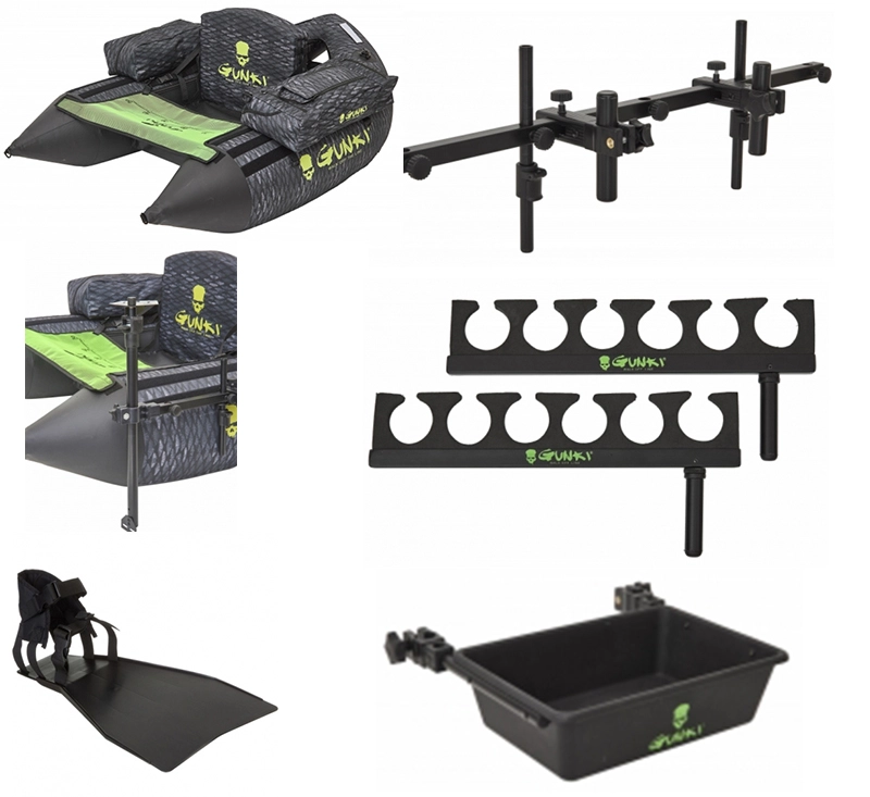Gunkis bestes Float Tube mit allem Zubehör!Float Tube Squad:Mit seiner stromlinienförmigen V-Form, dem bequemen Sitz und dem exzellenten Auftrieb macht dieses Float Tube das Bewegen auf dem Wasser einfach!Außergewöhnlich stabil können Sie schnell an die besten Angelstellen gelangen. Er ist unglaublich wendig und liegt dennoch unauffällig im Wasser. Ausgeführt in einer Camo-Fischfarbe für zusätzliche Diskretion. Abnehmbare reflektierende Sicherheitsbänder mit Klettverschluss.Besteht aus:• Gunki Medium Tasche (x1)• Gunki Team Tasche (x1)• Reparaturset• Transportriemen• Fußpumpe• Rutenkratzer (x2)• Tragetasche• Reflektierende Sicherheitsbänder (3)Technische Daten:• Maximale Belastung: 145kg• Gewicht mit Taschen: 6,2kg• Schwimmender Sicherheitssitz aus hochdichtem Schaumstoff mit verstellbaren Gurten für die Rückenlehne• Boden aus Cordura 100D-Gewebe für minimalen Wasserwiderstand und zusätzliche Festigkeit• Abnehmbare und neu positionierbare Sicherheitstaschen• Zahlreiche Befestigungsringe• Verschiedene Aufbewahrungsmöglichkeiten (Netztasche am Rücken, Flaschenhalter/Rutenablage..)• Stauraum auf der Rückseite• Stromlinienförmige V-Form• Tragegriff• Aushakmatte mit Maßangaben Echolothalterung 58cm:Passt vorne an die Gunkis Zubehörstange. Gunki Accessory Bar 80cm:Passt einfach und sicher an die Ringe auf der rechten oder linken Seite Ihres Gunki Belly Bootes. Dies verwaltet alle Gunkis Float Tuber Zubehör.Rod Roost Set 33.5cm:Rod Halterungen für Gunkis Belly Boats. Kann überall entlang der Gunkis-Zubehörstange oder an der Schraube an den Beinen der Zubehörstange befestigt werden. Der Rutenhalter hat 6 40mm Schlitze.Seitliche Ablageschale 34x9x23cm:Sehr praktisches Werkzeug, um auf seinem Gunki Belly Boot zu haben. Passt auch auf Gunkis Zubehörstange.Kurzes Ruder-Fenor 24x45cm:Kurze Flossen mit großen Blättern, perfekt für präzises und sanftes Manövrieren, ohne zu müde zu werden. Entworfen für Ihr Bauchbootfischen, universelle Passform. werden natürlich paarweise verkauft.