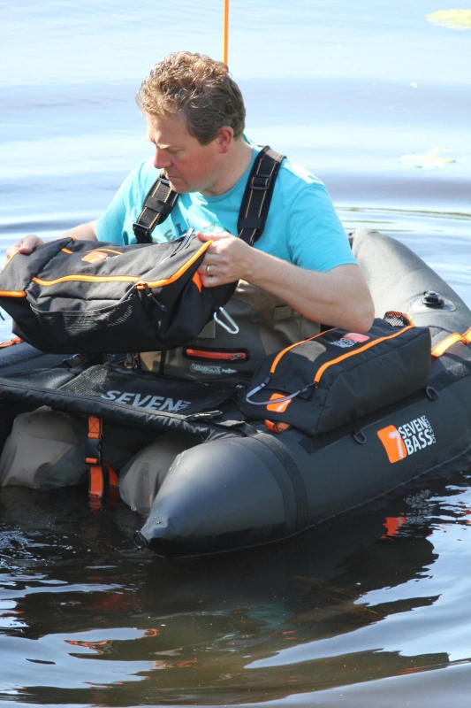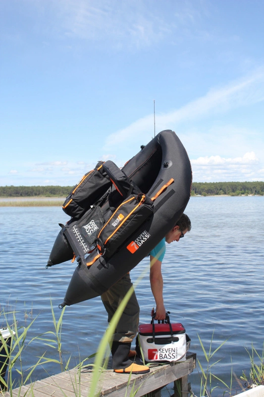 The Element is V-shaped, weighs approximately 15 lbs (6,8kg), and has two color coded internal air chambers for easy inflation. This model offers a wider foam seat than Seven Bass Bolt. There are two back seat rod holders, and an open storage space behind the seat, ideal for assorted fishing extras (small cooler, pan net, etc.). The Clipline system is designed to anchor loose equipment with lanyards and secure cargo side bags.Performance Material:They’ve incorporated a PVC bottom to minimize risk of puncture from under water hazards. For improved visibility, there is a security flag holder and bright orange accents.Pocket Apron:Exclusive pocket apron conveniently allows anglers to keep their lures and tackle essentials close at hand. The shallow pocket with double zip closer fits an assortment of small tackle boxes.Clipline:Storage side bags will no longer hurt your casting technique. The CLIPLINE system is a secure line that runs along the sides of the float tube, is design for versatility. Place the CLIP cargo side bags were you see fit for maximum comfort.Length 165 cmWidth 112 cmØ air chambers 34 cmWeight 6.8 kgMax. load 136 kgBottom: PVC 1000DTop: Crodura 600DAir chambers: 0,45mmClipline: YesRod Holder: 2Valves: Boston